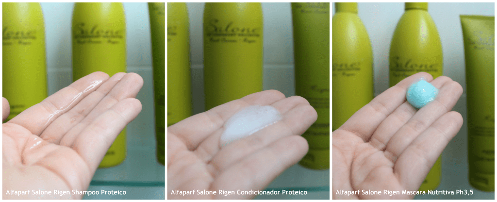 A linha é composta do Alfaparf Salone Rigen Shampoo Proteico, Alfaparf Salone Rigen Condicionador Proteico e Alfaparf Salone Rigen Máscara Nutritiva Ph3,5. A Alfaparf e essa linha não deixaram nada a desejar na minha opinião. Tenho usado desde que testei e o resultado permanece ótimo! Os produtos tem cheiro de salão de beleza – hum! – oferecem minerais, proteína do leite, vitaminas A, B e C.