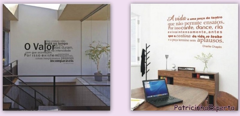 Você pode mandar fazer uma frase que gosta muito para por na parede e o preço em média é de R$ 40,00, ou também , escolher alguma pronta a qual se inspire. Tenho uma amiga que colocou na sala de estar um adesivo de árvore e ficou muito legal.