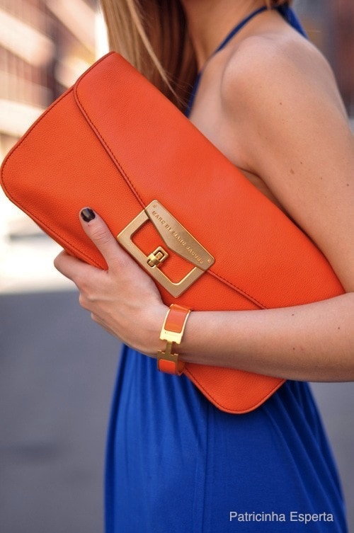 Para as peças de roupa tangerina e azul, tome cuidado. Não arrisque na mistura, prefira combinar as roupas com um acessório preto ou nude.