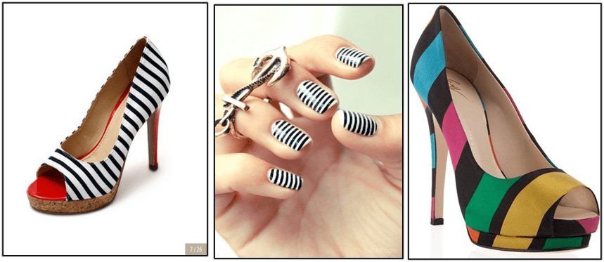 As mais ousadas vão além, usam as listras nas unhas, uau!!! Fica um charme só!! falando em ousadia, tem alguns sapatos, não muito delicado que também são marcantes com belas listras, aja ousadia!!