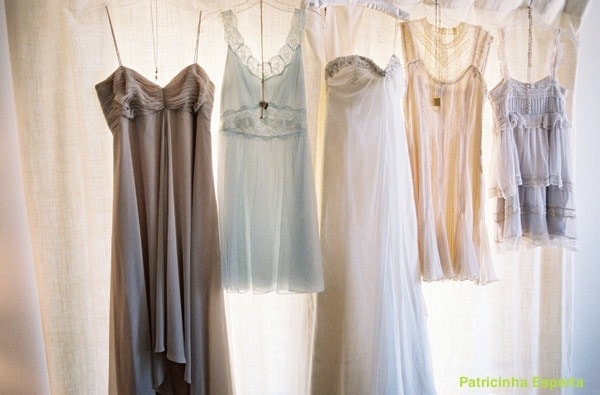 1) Os vestidos devem ser guardados em cabides que tem ganchos internos, para que as alças fiquem bem firmes e não escorreguem
