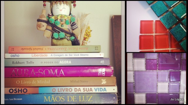 Outros detalhes da semana: amando uma bolsinha de franjas que comprei numa feira de couro (baratíssima!), sem perder a mania de ficar descalça nos lugares ( mesmo o sapato sendo mega confortável, tenho que tirar! hehehe), enchendo a minha caixinha de óleos essenciais (amo!), testando horrores o rímel que faz os cílios crescerem e tentando, a todo custo, mudar meus livros de cabeceira, mas não consigo, sou leonina e, consequentemente, apegada!