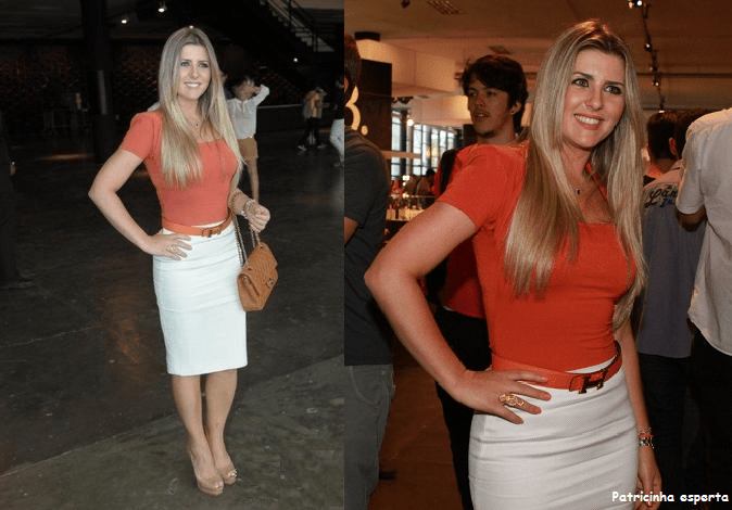 Eu acho que ela sempre se veste muito bem. Esse ficou charmosos e elegante, a saia branca de cintura alta afinou a silhueta, destacando o corpão, a blusa e o cinto alaranjadas deram o devido destaque a composição. O sapato e a bolsa de cor neutra arremataram o conjunto. Chique no úrtimo…