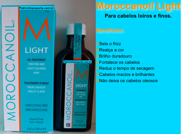 O MOROCCANOIL LIGHT é indicado para cabelos finos ou loiros.  Quem tem cabelos oleosos pode usar o produto sem medo. Meu cabelo é fino, oleoso na raiz e ressecado nas pontas, eu usei o produto com os cabelos secos, úmidos, até como máscara de hidratação e meus cabelos não ficaram oleosos.