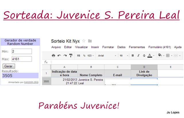 Meninas, acabei de realizar o sorteio, com 34 minutos de atraso (ops, já passou da meia noite e eu ainda estou na frente do computador!rs) e a sorteada foi Juvenice S. Pereira Leal. Parabéns!