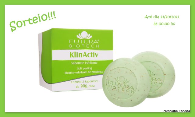 A Futura Biotech está promovendo um brinde para a mulher ( e o homem, viu Jean?) que valoriza a beleza e o cuidado com a pele, por isso, além de oferecer esse prêmio, a marca está com uma campanha promocional onde a gente paga por um Sabonete Esfoliante KlinActive e recebe dois, não é legal?