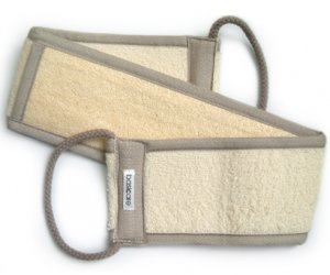 A tira exfoliante é feita de fibra vegetal natural e sua esponja também natural, é feita da fruta seca de uma planta.