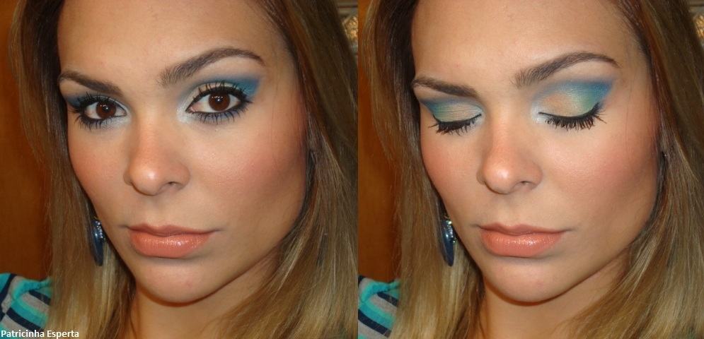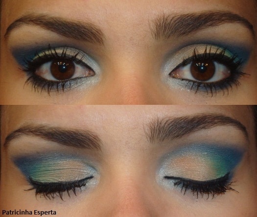 Do meio da pálpebra até quase o final, coloquei a sombra verde claro e a turquesa por cima, pra chegar no tom que eu queria.