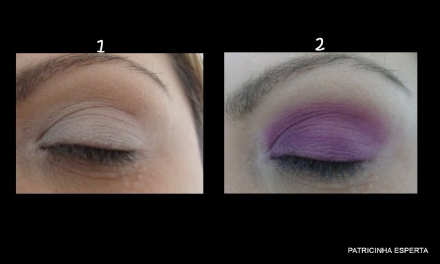 Comecei espalhando um pouco de lápis branco em toda a pálpebra móvel  bem de leve, só para clarear um pouco o tom da minha pálpebra ( foto 1). Feito isso, espalhei a sombra rosa , a número 1 da foto que está no final desse tutorial, por cima do lápis branco e também no côncavo (foto 2).