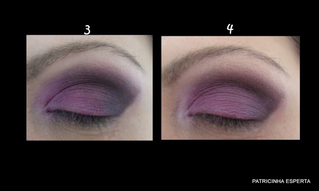 Apliquei a sombra marrom no côncavo e no canto externo  e fui puxando levemente para o centro da pálpebra esfumando bastante ( foto 3). Depois pego a sombra número 2, que é um rosa mais claro, e marco o canto interno dos olhos ( foto 4).