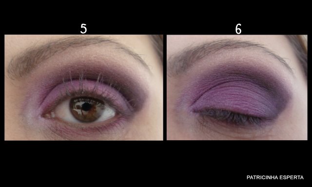 Aplico a sombra rosa escura, a número 1, na linha abaixo dos cílios inferiores ( foto 5 ) e a sombra rosa clara rente as sobrancelhas ( foto 6).