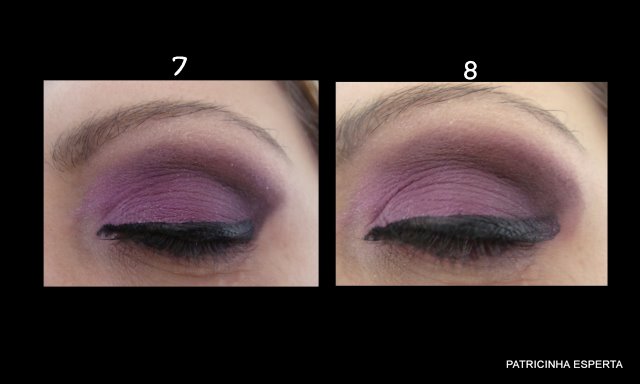 Delineio a linha dos cílios superiores com delineador preto ( foto 7). Como achei que o delineado ficou curto puxei mais um pouco para o canto externo ( foto 8).
