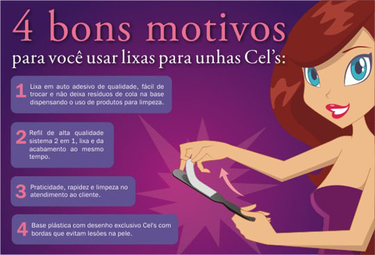 “Sabemos que as mãos e os pés fazem parte da nossa estética e buscamos deixa-los sempre bonitos, pois também refletem diretamente em nossa imagem. Pensando em tais fatos e no propósito de solucioná-los, a Cel’s desenvolveu a lixa descartáveis para a higiene e tratamento das unhas.”